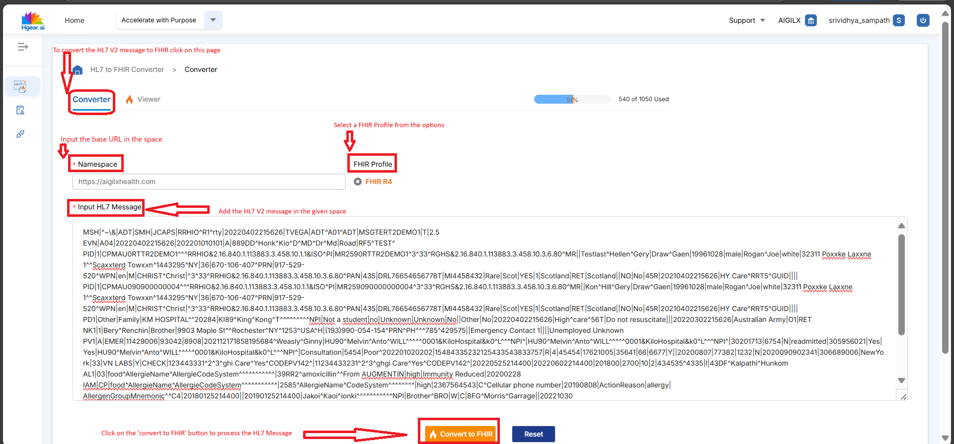 complete HL7 v2 message that you want to convert. Ensure that the message