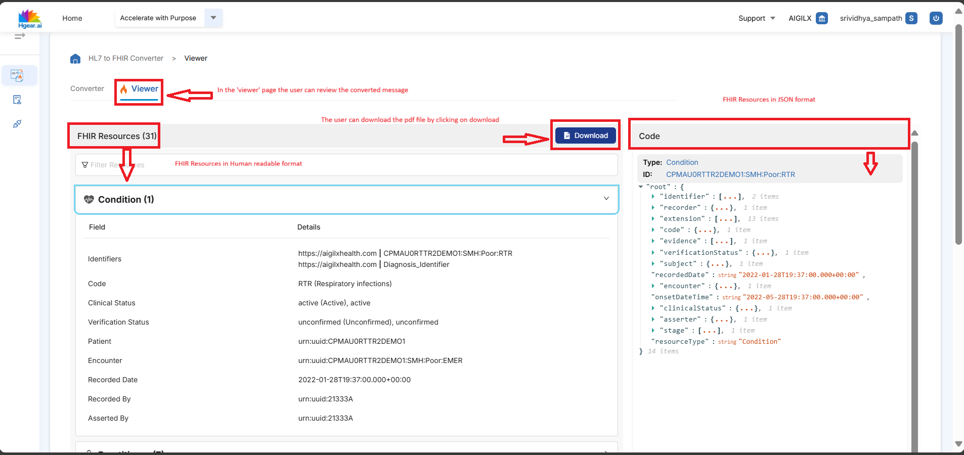 In the Viewer tab, the converted FHIR message will be displayed in two formats: